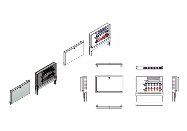 Die modulare Anschlussstation für Flächenheizung ist im Unterputzschrank montiert und umfasst einen Edelstahlverteiler mit regulierbaren Durchflussanzeigern und Ventileinsätzen (M30x1,5), sowie eine horizontale Anschlussgarnitur ohne Wärmezählerverrohrung. Die vormontierten und verdrahteten Stellantriebe sind auf einer montierten Klemmleiste installiert. Es gibt Platzhaltungen für Anschlussgarnituren mit oder ohne Wärmezählerverrohrung.