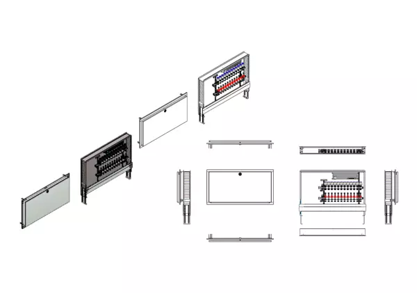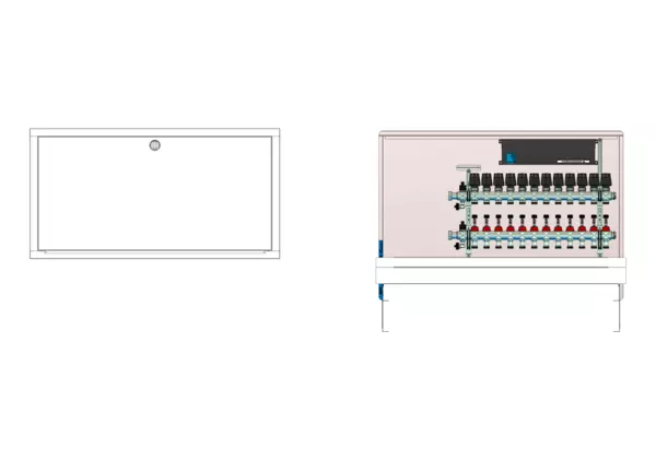 Die modulare Anschlussstation für Flächenheizung ist im Unterputzschrank montiert und umfasst einen Edelstahlverteiler mit regulierbaren Durchflussanzeigern und Ventileinsätzen (M30x1,5), sowie eine horizontale Anschlussgarnitur ohne Wärmezählerverrohrung. Die vormontierten und verdrahteten Stellantriebe sind auf einer montierten Klemmleiste installiert. Es gibt Platzhaltungen für Anschlussgarnituren mit oder ohne Wärmezählerverrohrung.
