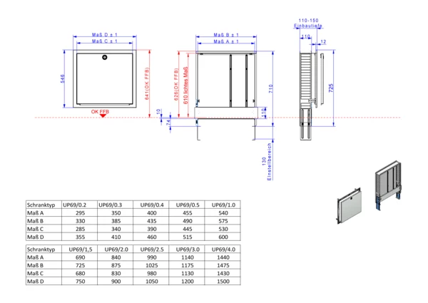 Frontblende tiefenverstellbar 110-150 mm, Schrank höhenverstellbar von 710-840 mm