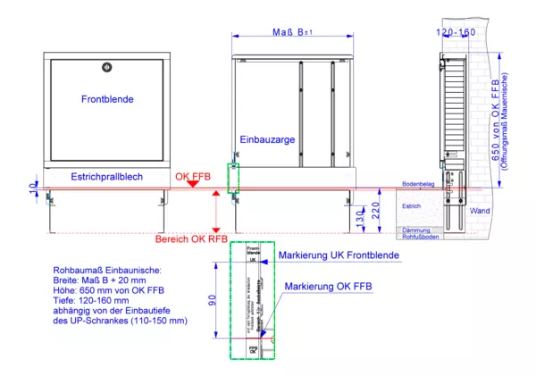 Frontblende tiefenverstellbar 110-150 mm, Schrank höhenverstellbar von 710-840 mm