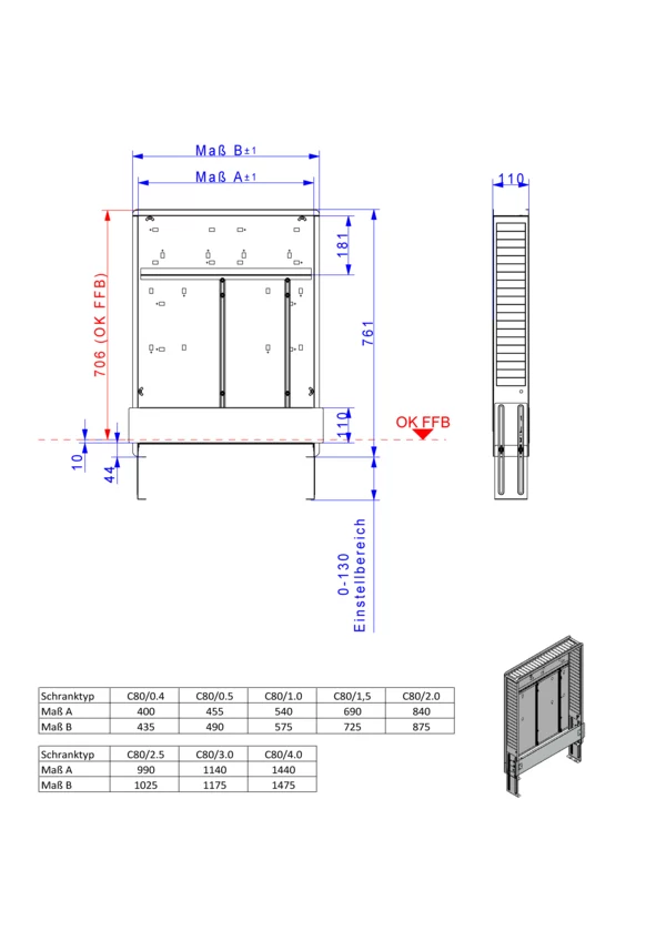 • höhenverstellbare Schrankfüße für Fußbodenaufbau minimal 54 mm und maximal 184 mm