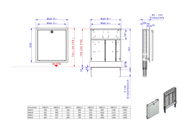 Frontblende tiefenverstellbar 80-120 mm, Schrank höhenverstellbar von 760-890 mm