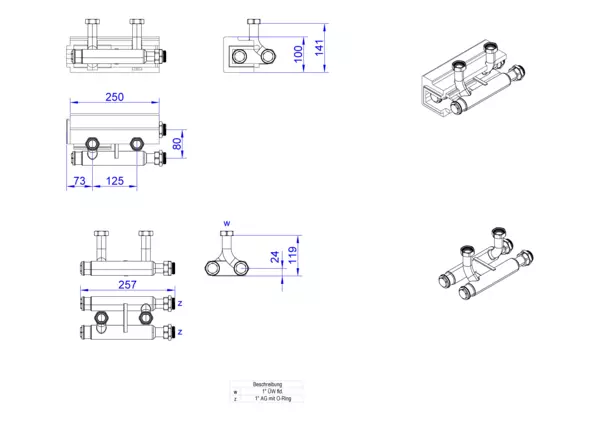 Erweiterung von strawi 125-25 Kesselverteilern um einen weiteren Heizkreis, seitliche Primäranschlüsse und nach oben geführte Sekundäranschlüsse, mit Dämmung