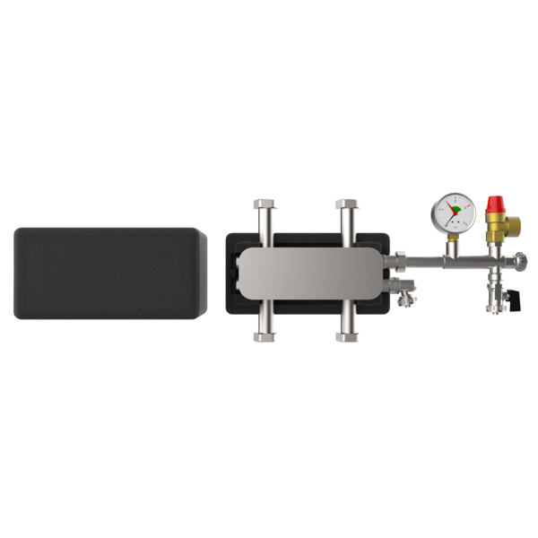 Die Verrohrung der Aufbaugruppe besteht aus Edelstahl 1.4103 DN25. Das variable Wärmezählerpassstück 1" Baulänge 130 mm und 3/4" Baulänge 110 mm
