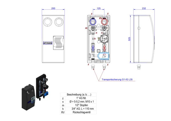 strawa strawi 125-25 Aufbaugruppe MK2-WMZ-SM,BxHxT: 250 x 525 x 232 mm, f. geregel. Hkr. Pumpe Alpha2 m. Stellmotor mit Wärmezählerverrohrung