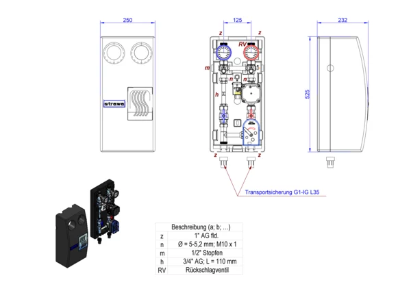strawa strawi 125-25 Aufbaugruppe FW1-WMZ-SM,BxHxT: 250 x 525 x 232 mm, f. festwertgeregel. Hkr. Pumpe UPM3 m. Stellmotor mit Wärmezählerverrohrung