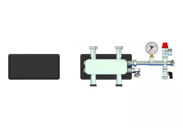 Die Systemtrennung besteht aus einem kupfergelötetem Plattenwärmetauscher aus Edelstahl und einer Sicherheitsgruppe mit Sicherheitsventil 2,5 bar, Manometer 0-4 bar, KFE-Hahn und ein 3/4" Anschluss für ein Membranausdehnungsgefäß.