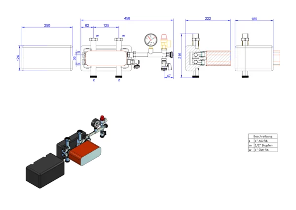 strawa strawi 125-25 Systemtrennung PWT 30 kW 1''AG x 1''ÜWM,BxHxT: 250 x 195 x 172 mm, Montage zwischen strawi 125-25 Kesselverteiler und strawi 125-25 Aufbaugruppe