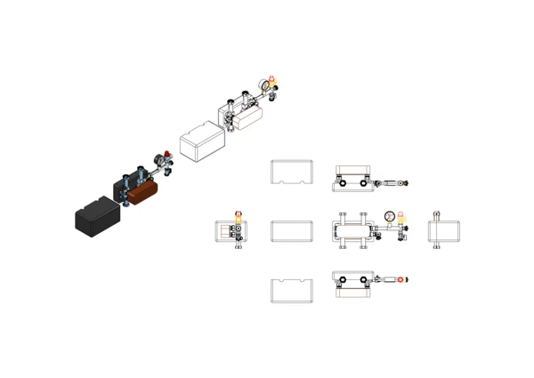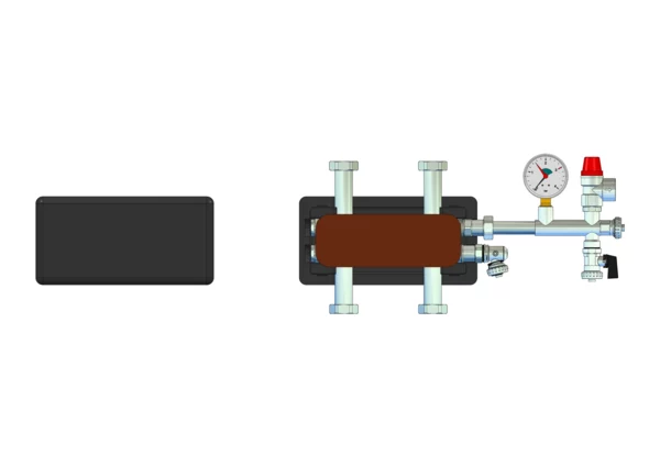 Die Systemtrennung besteht aus einem kupfergelötetem Plattenwärmetauscher aus Edelstahl und einer Sicherheitsgruppe mit Sicherheitsventil 2,5 bar, Manometer 0-4 bar, KFE-Hahn und ein 3/4" Anschluss für ein Membranausdehnungsgefäß.