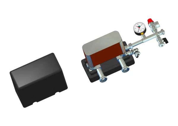 Die Systemtrennung besteht aus einem kupfergelötetem Plattenwärmetauscher aus Edelstahl und einer Sicherheitsgruppe mit Sicherheitsventil 2,5 bar, Manometer 0-4 bar, KFE-Hahn und ein 3/4" Anschluss für ein Membranausdehnungsgefäß.
