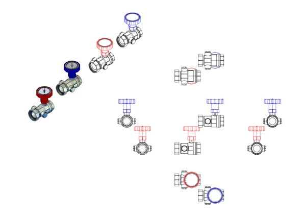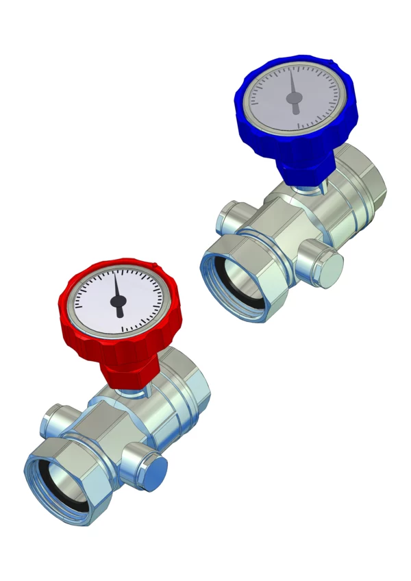 Das Thermometer-Kugelhahnset dient als primäre Absperrung bei strawi 125-25 und 125-40 kesselverteilern in Verbindung mit strawi 125 Winkelanschlüssen.