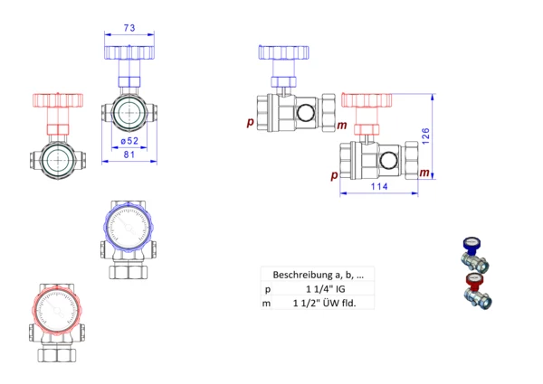 passend für strawi 125 Winkelanschluss, mit Thermometer im Kugelhahngriff 0-120 Grad Celsius, Anschlussgewinde: 1 1/2"ÜW fld x 1 1/4"IG