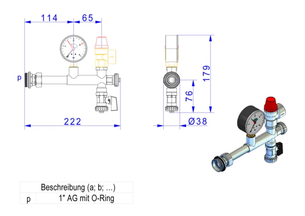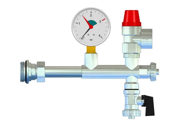 Sie besteht aus Sicherheitsventil 2,5 bar, Manometer 0-4 bar und einem 3/4" Anschluss für Membranausdehnunggefäße.