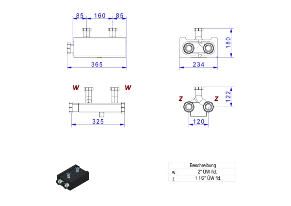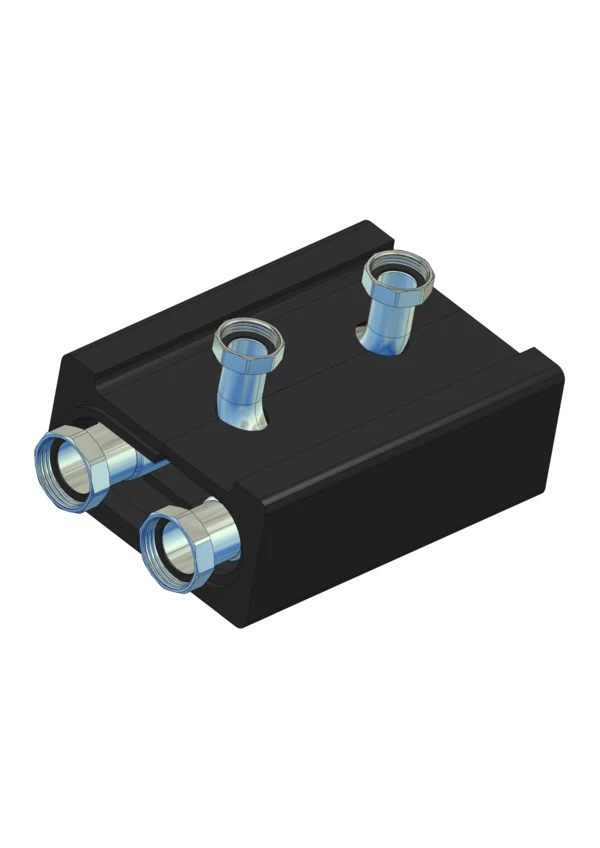 Die Abgänge sind nebeneinander als Vorlauf- und Rücklaufrohr mittig linear nach oben gezogen und enden mit einer 1 1/2“ Überwurfmutter.