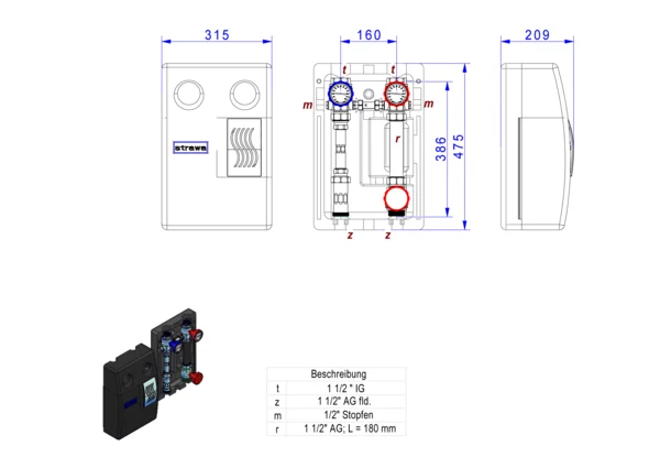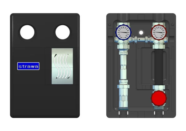 strawa strawiola 160 VA Aufbaugruppe HK40-WMZ,BxHxT: 320 x 470 x 215 mm, f. ungeregel. Hkr. ohne Pumpe, Pumpendistanzstück 1 1/2" Länge 180 mm, mit Wärmezählerverrohrung, Sekundäranschluss 1 1/2"IG
