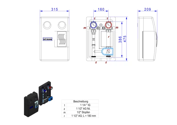 strawa strawiola 160 VA Aufbaugruppe MK32-WMZ,BxHxT: 320 x 470 x 215 mm, 230 V, f. geregel. Hkr. ohne Pumpe, Pumpendistanzstück 1 1/2" Länge 180 mm, mit Wärmezählerverrohrung, Sekundäranschluss 1 1/4"IG