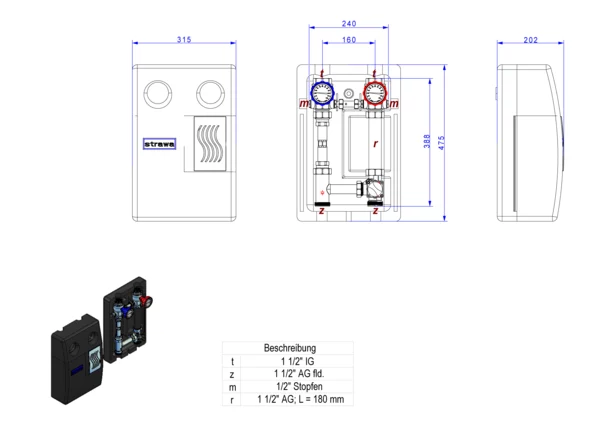 strawa strawiola 160 VA Aufbaugruppe MK40-WMZ ohne Stellmotor,BxHxT: 320 x 470 x 215 mm, f. geregel. Hkr. ohne Pumpe, Pumpendistanzstück 1 1/2" Länge 180 mm, mit Wärmezählerverrohrung, Sekundäranschluss 1 1/2"IG