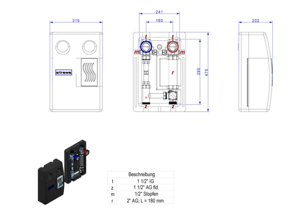 strawa strawiola 160 VA Aufbaugruppe MK40-2-WMZ ohne Stellmotor,BxHxT: 320 x 470 x 215 mm, f. geregel. Hkr. ohne Pumpe, Pumpendistanzstück 2" Länge 180 mm, mit Wärmezählerverrohrung, Sekundäranschluss 1 1/2"IG