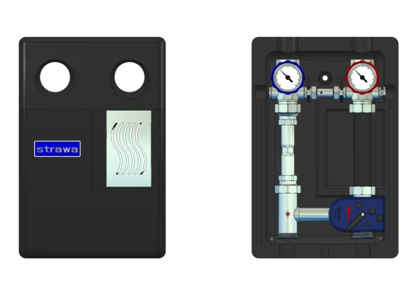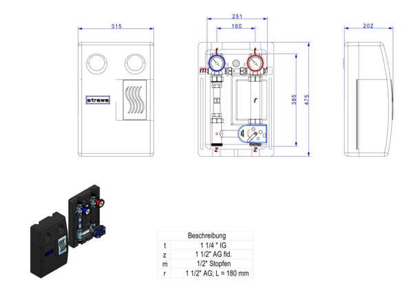 strawa strawiola 160 VA Aufbaugruppe FW32-WMZ,BxHxT: 320 x 470 x 215 mm, festwertgeregel. Hkr. ohne Pumpe, Pumpendistanzstück 1 1/2" Länge 180 mm, mit Wärmezählerverrohrung, Sekundäranschluss 1 1/4"IG