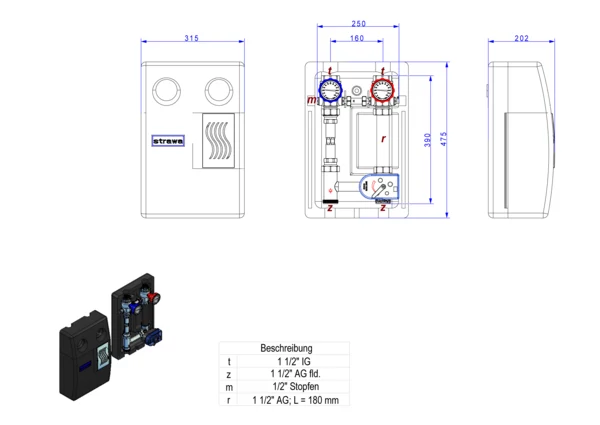 strawa strawiola 160 VA Aufbaugruppe FW40-WMZ,BxHxT: 320 x 470 x 215 mm, festwertgeregel. Hkr. ohne Pumpe, Pumpendistanzstück 1 1/2" Länge 180 mm, mit Wärmezählerverrohrung, Sekundäranschluss 1 1/2"IG