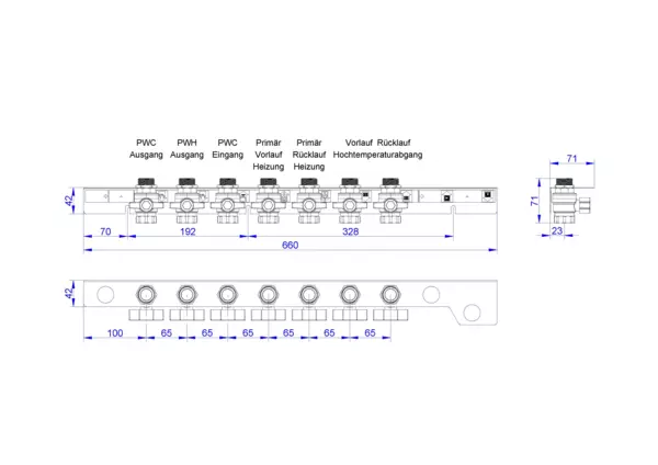 strawa Friwara WM-AS10-2-KH7,BxHxT: 660 x 71 x 71 mm, Anschlussschiene für Hydraulikmodul TWE-HT und TWE-FBR-HT, 3x Trinkwasser und 4x Heizung