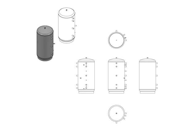 • Systemanschlüsse oben und unten, ausgestattet mit Gehrungsrohr zum Boden, gerichtet zur Strömungsberuhigung und Volumenausnutzung. Die Systemanschlussstutzen sind in 90° Abständen zueinander angeordnet.