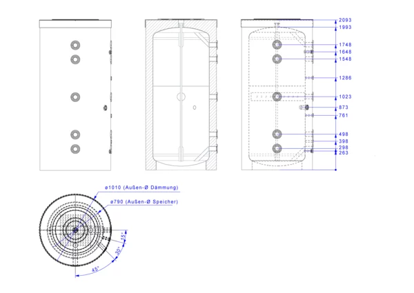 • Systemanschlüsse oben und unten, ausgestattet mit Gehrungsrohr zum Boden, gerichtet zur Strömungsberuhigung und Volumenausnutzung. Die Systemanschlussstutzen sind in 90° Abständen zueinander angeordnet.