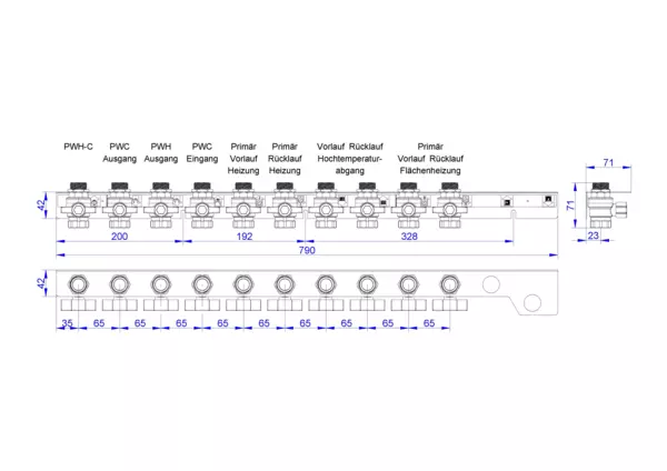 strawa Friwara WM-AS12-1-KH10-Z,BxHxT: 790 x 71 x 71 mm, Anschlussschiene für Hydraulikmodul TWE-4L-HT-Z, 4x Trinkwasser und 6x Heizung