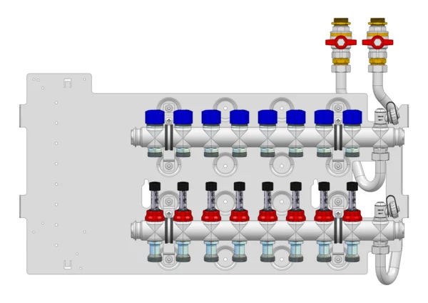 strawa Friwara WM-VT-63-GB1,5-KH 8 Hkr.,BxHxT: 691 x 472 x 105 mm, Flächenheizungsverteiler mit Durchflussanzeiger 0-3 l/min im Vorlauf und Ventiileinsätzen M30x1,5 im Rücklauf, SFEE-Ventil im Vor- und Rücklauf, Grundblech 1,5
