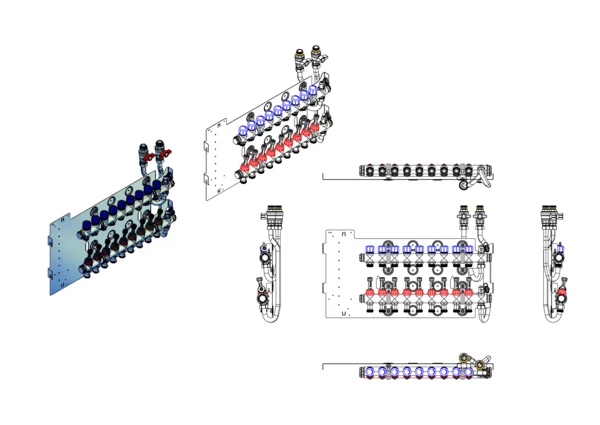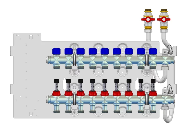 strawa Friwara WM-VT-63-GB1,5-KH 9 Hkr.,BxHxT: 691 x 472 x 105 mm, Flächenheizungsverteiler mit Durchflussanzeiger 0-3 l/min im Vorlauf und Ventiileinsätzen M30x1,5 im Rücklauf, SFEE-Ventil im Vor- und Rücklauf, Grundblech 1,5