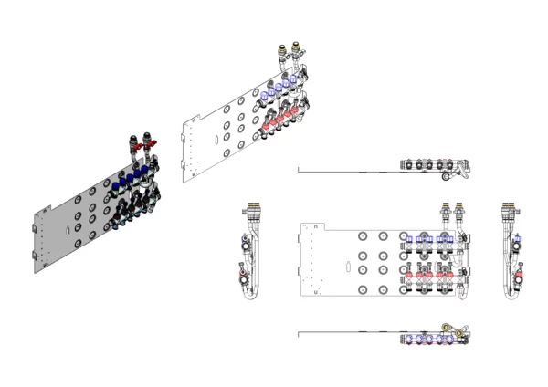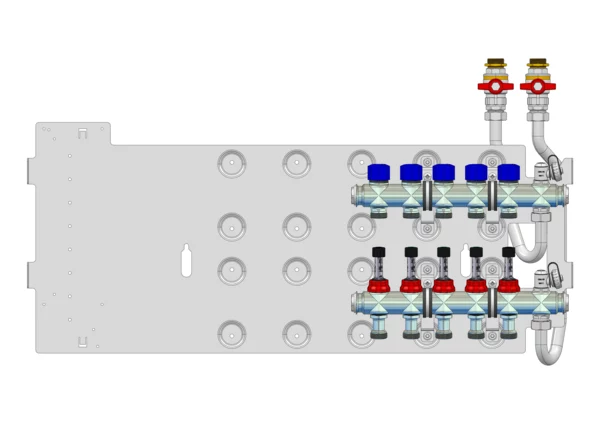 strawa Friwara WM-VT-63-GB2,0-KH 5 Hkr.,BxHxT: 841 x 472 x 105 mm, Flächenheizungsverteiler mit Durchflussanzeiger 0-3 l/min im Vorlauf und Ventiileinsätzen M30x1,5 im Rücklauf, SFEE-Ventil im Vor- und Rücklauf, Grundblech 2,0