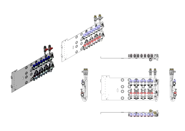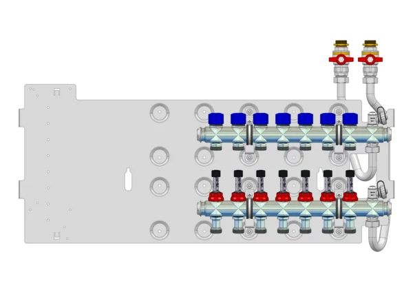 strawa Friwara WM-VT-63-GB2,0-KH 7 Hkr.,BxHxT: 841 x 472 x 105 mm, Flächenheizungsverteiler mit Durchflussanzeiger 0-3 l/min im Vorlauf und Ventiileinsätzen M30x1,5 im Rücklauf, SFEE-Ventil im Vor- und Rücklauf, Grundblech 2,0