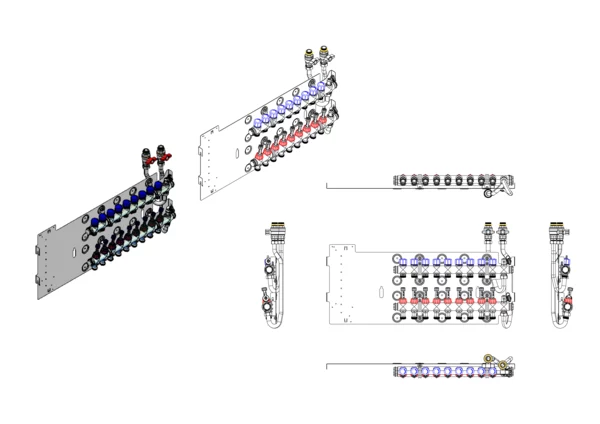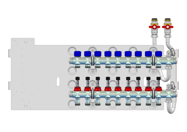 strawa Friwara WM-VT-63-GB2,0-KH 9 Hkr.,BxHxT: 841 x 472 x 105 mm, Flächenheizungsverteiler mit Durchflussanzeiger 0-3 l/min im Vorlauf und Ventiileinsätzen M30x1,5 im Rücklauf, SFEE-Ventil im Vor- und Rücklauf, Grundblech 2,0