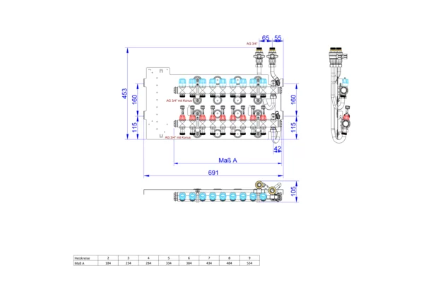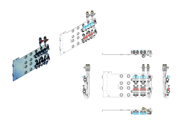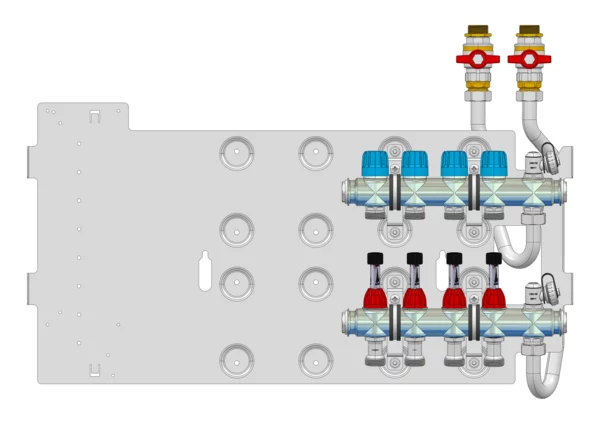 strawa Friwara WM-VT-18-GB1,5-KH 4 Hkr.,BxHxT: 691 x 472 x 105 mm, Flächenheizungsverteiler mit Durchflussanzeiger min/max im Vorlauf, Ventiileinsätzen mit Aufnahme EGO-Schnellverschluss im Rücklauf, SFEE-Ventil im Vor- und Rücklauf, Grundblech 1,5
