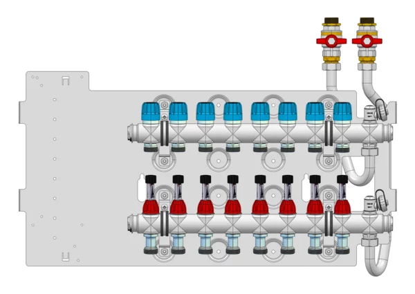 strawa Friwara WM-VT-18-GB1,5-KH 8 Hkr.,BxHxT: 691 x 472 x 105 mm, Flächenheizungsverteiler mit Durchflussanzeiger min/max im Vorlauf, Ventiileinsätzen mit Aufnahme EGO-Schnellverschluss im Rücklauf, SFEE-Ventil im Vor- und Rücklauf, Grundblech 1,5