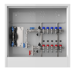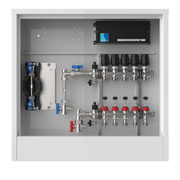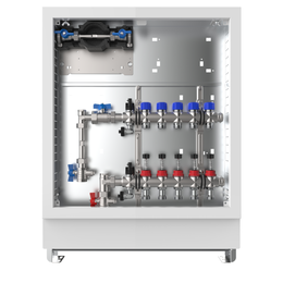 strawa Comfort Anschlussstation FBH-63-V-W1-WMZ-C69 5 Hkr.,BxHxT: 600 x 775 x 122 mm, vert. AG. m. WMZ, Verteiler m. DFA 0-3 l/min + THV M30x1,5, Wasserzählerstr. TW kalt, CUP-Schrank m. Frontbl. in RAL 9016