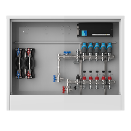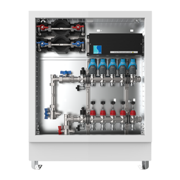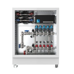 strawa Comfort Anschlussstation FBH-18-V-W2-WMZ-C69-EGO 6 Hkr.,BxHxT: 750x775x122 mm, vert. AG m. WMZ, Verteiler mit DFA min/max+THV, m. vorm. EGO-Regelantr. u. Klemml. mit Vorverdr., Wasserzählerstr. TW kalt u. warm, CUP-Schrank m. Frontbl. RAL 9016