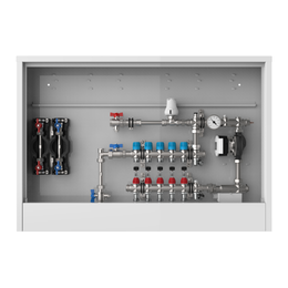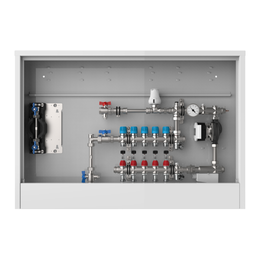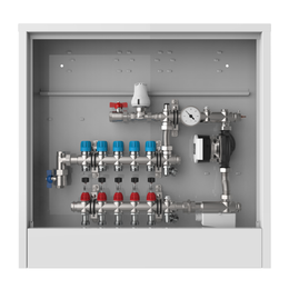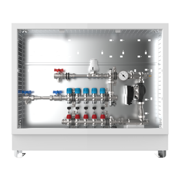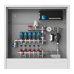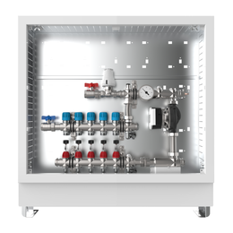 strawa Comfort Regelstation FBR-18-V-WMZ-CA-EGO 5 Hkr.,BxHxT: 882 x 710 x 125 mm, Festwert 20-50°C mit Pumpe, vert. AG m. WMZ, Verteiler mit DFA min/max + THV f. EGO, vorm. EGO-Regel. + Klemml. m. Vorverdr., Comfort-AP-Schrank in RAL 9016