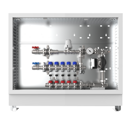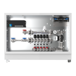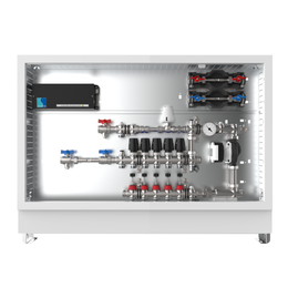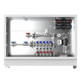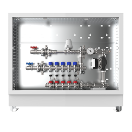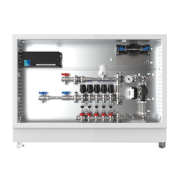 strawa Comfort Kompakt-Regelstation FBR-63-HT1-H-WMZ-C69-E 6 Hkr.,BxHxT: 1050 x 775 x 122 mm, Festwert 20-50°C m. Pumpe, 1x HT-Abgang, horz. AG m. WMZ, Verteiler m. DFA 0-3 l/min+THV M30x1,5, vorm. Stellantr., CUP-Schrank RAL 9016