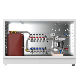 strawa Comfort-Regelstation FBR-S10-63-V-W2-WMZ-C69 5 Hkr.,BxHxT: 1200 x 775 x 122 mm, Systemtr. m. Festwert 20-50°C+Pumpe, vert. AG m. WMZ, Verteiler mit DFA 0-3 l/min + THV M30x1,5, WZ-TW kalt+warm, Comfort-UP-Schrank m. Frontbl. RAL 9016