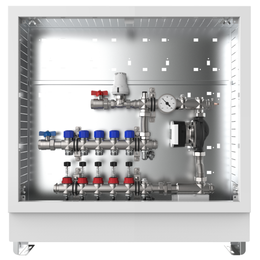 strawa Comfort Regelstation FBR-63-V-CA 5 Hkr.,BxHxT: 732 x 710 x 125 mm, Festwert 20-50°C mit Pumpe, vert. AG o. WMZ, Verteiler mit DFA 0-3 l/min + THV M30x1,5, Comfort-AP-Schrank in RAL 9016