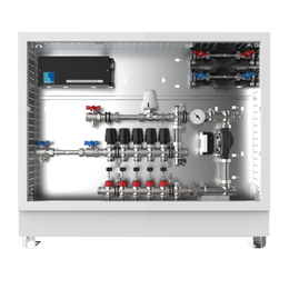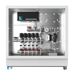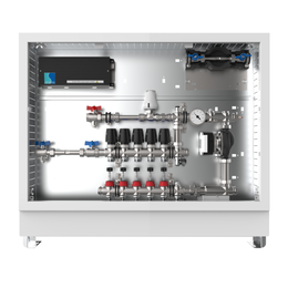 strawa Comfort Regelstation FBR-63-H-C69-E 5 Hkr.,BxHxT: 750 x 775 x 122 mm, Festwert 20-50°C mit Pumpe, horz. AG o. WMZ, Verteiler mit DFA 0-3 l/min + THV M30x1,5, vorm. Stellantr. + Klemml. m. Vorverdraht., Comfort-UP-Schrank m. Frontbl. RAL 9016