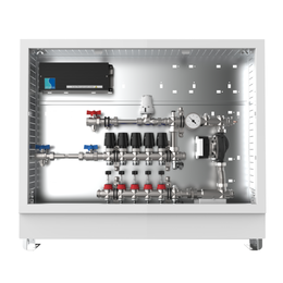 strawa Comfort Regelstation FBR-63-H-WMZ-C69-E 6 Hkr.,BxHxT: 1050 x 775 x 122 mm, Festwert 20-50°C mit Pumpe, horz. AG m. WMZ, Verteiler mit DFA 0-3 l/min + THV M30x1,5, vorm. Stellantr. + Klemml. m. Vorverdraht., Comfort-UP-Schrank m. Frontbl. RAL 9016