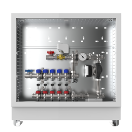 strawa Comfort Mischstation FBM-63-H-C69 8 Hkr.,BxHxT: 900 x 775 x 122 mm, Mischg. m 3P SM mit Pumpe, horz. AG o. WMZ, Verteiler mit DFA 0-3 l/min + THV M30x1,5, Comfort-UP-Schrank m. Frontbl. RAL 9016