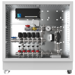 strawa Comfort Mischstation FBM-63-H-C69 11 Hkr.,BxHxT: 1050 x 775 x 122 mm, Mischg. m 3P SM mit Pumpe, horz. AG o. WMZ, Verteiler mit DFA 0-3 l/min + THV M30x1,5, Comfort-UP-Schrank m. Frontbl. RAL 9016