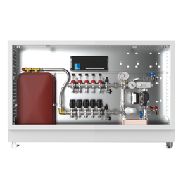 strawa Comfort-Regelstation FBR-S10-63-H-C69-E 5 Hkr.,BxHxT: 1200 x 775 x 122 mm, Systemtr. m. Festwert 20-50°C+Pumpe, horz. AG o. WMZ, Verteiler mit DFA 0-3 l/min + THV M30x1,5, vorm. Stellantr.+Klemml.+Vorverdr., Comfort-UP-Schrank m. Frontbl. RAL 9016
