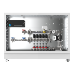 strawa Comfort Kompakt-Mischstation FBM-63-HT1-H-WMZ-C69-E 6 Hkr.,BxHxT: 1050 x 775 x 122 mm, Mischg. m 3P SM m. Pumpe, 1x HT-Abgang, horz. AG m. WMZ, Verteiler m. DFA 0-3 l/min+THV M30x1,5, vorm. Stellantr., CUP-Schrank RAL 9016