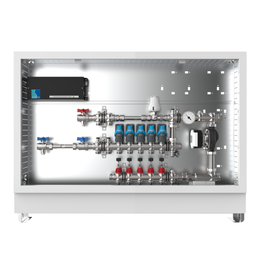 strawa Comfort Kompakt-Regelstation FBR-18-HT1-H-WMZ-C69-EGO 6 Hkr.,BxHxT: 1050 x 775 x 122 mm, Festwert 20-50°C m Pumpe, 1x HT-Abg, horz. AG m. WMZ, Verteiler m. DFA min/max+THV für EGO, vorm. EGO-Regel., CUP-Schrank RAL 9016