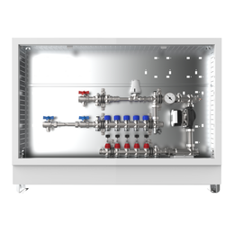 strawa Comfort Kompakt-Regelstation FBR-63-HT2-H-WMZ-C69-E 5 Hkr.,BxHxT: 1050 x 775 x 122 mm, Festwert 20-50°C m. Pumpe, 2x HT-Abgang, horz. AG m. WMZ, Verteiler m. DFA 0-3 l/min+THV M30x1,5, vorm. Stellantr., CUP-Schrank RAL 9016