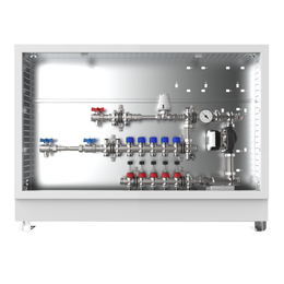 strawa Comfort Kompakt-Regelstation FBR-63-HT1-H-WMZ-C69-E 7 Hkr.,BxHxT: 1050 x 775 x 122 mm, Festwert 20-50°C m. Pumpe, 1x HT-Abgang, horz. AG m. WMZ, Verteiler m. DFA 0-3 l/min+THV M30x1,5, vorm. Stellantr., CUP-Schrank RAL 9016